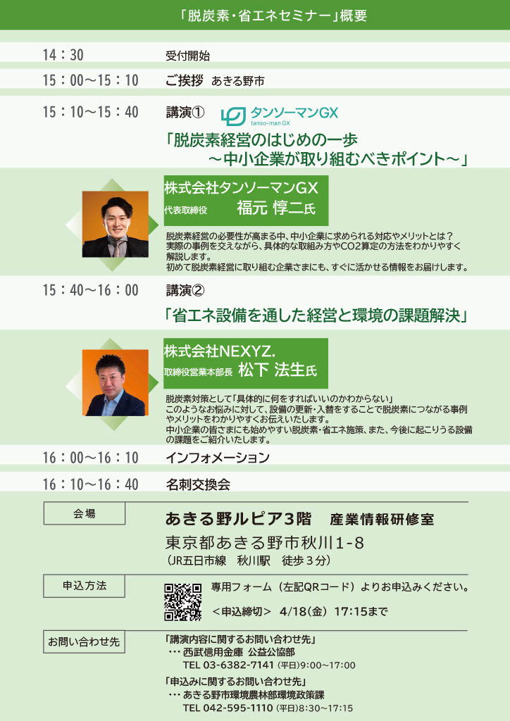 脱炭素経営支援を行う株式会社タンソーマンGX(本社:東京都港区南青山3-3-3、代表取締役:福元惇二)は、2025年4月24日(木)に開催される「脱炭素・省エネセミナー」(あきる野市・西武信用金庫共催)にて、登壇・講演を行います。
