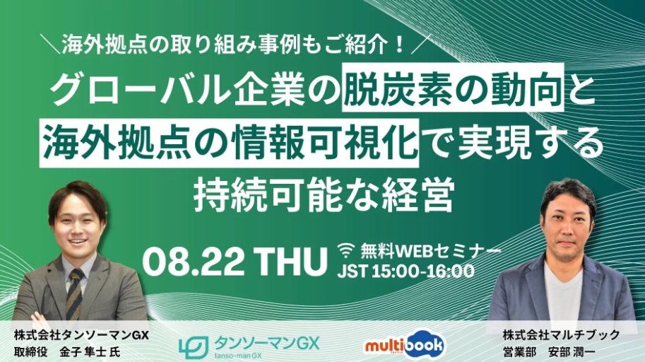 2024/8/22(木)15:00【WEBセミナー】グローバル企業の脱炭素の動向と海外拠点の情報可視化で実現する持続可能な経営